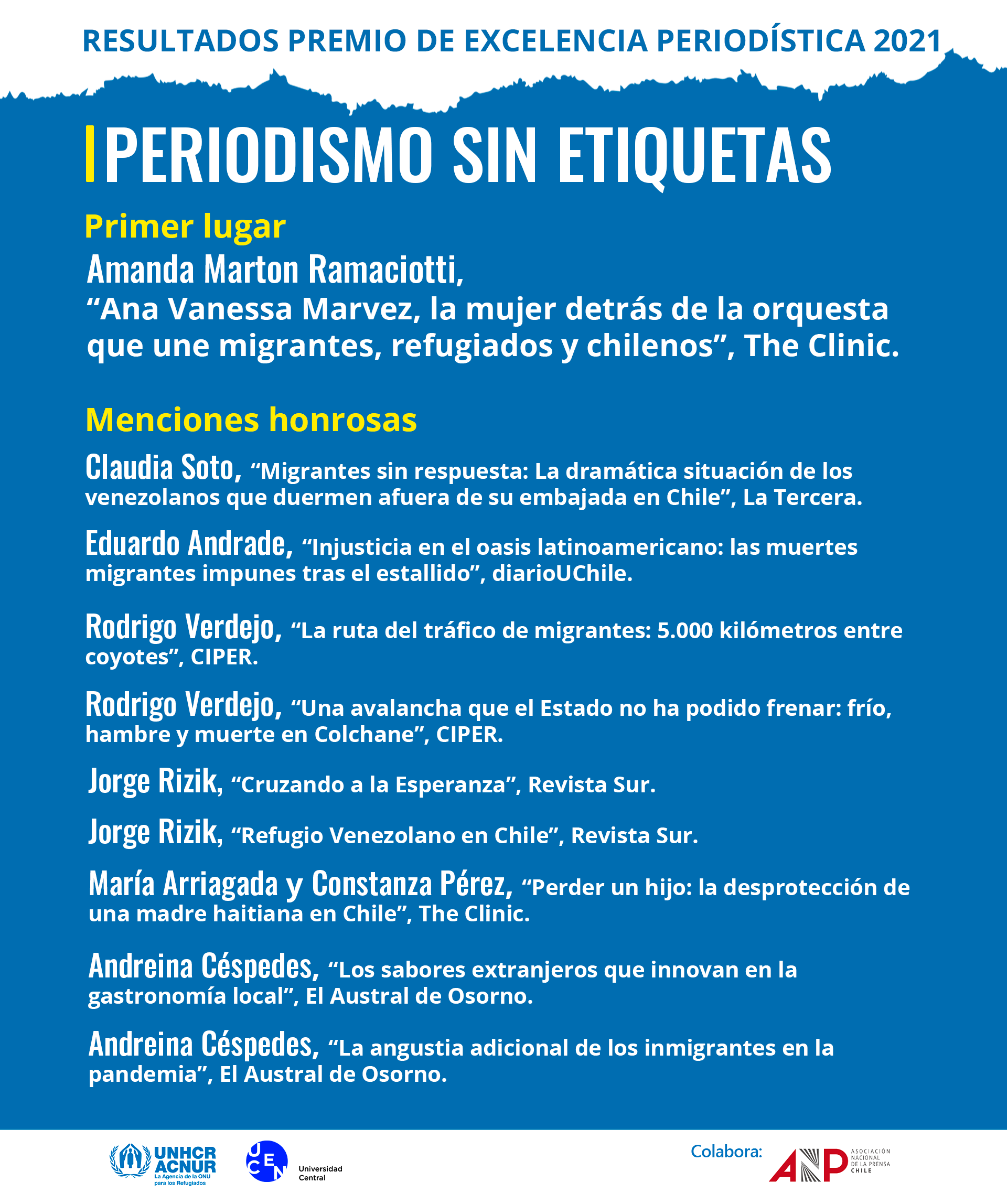 ACNUR, la Agencia de la ONU para los Refugiados y la Carrera de Periodismo de la Escuela de Gobierno y Comunicaciones de la Universidad Central de Chile tienen el agrado de presentar la Segunda Versión del Premio de Excelencia Periodística “Periodismo Sin Etiquetas”, un concurso anual que distingue a los mejores trabajos periodísticos publicados en medios nacionales escritos, radiales, televisivos o digitales con el objetivo de visibilizar la realidad de las personas refugiadas, desplazadas y situación de movilidad humana en Chile, mediante un periodismo de excelencia y libre de estereotipos.